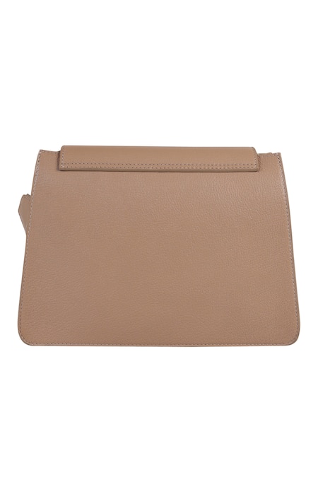 Beige leather handbag featuring a flap detail with a 3D floral motif turn lock
