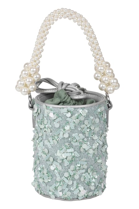 Silver potli bag featuring mint clustered sequin embellishment and handcrafted pearl handle
