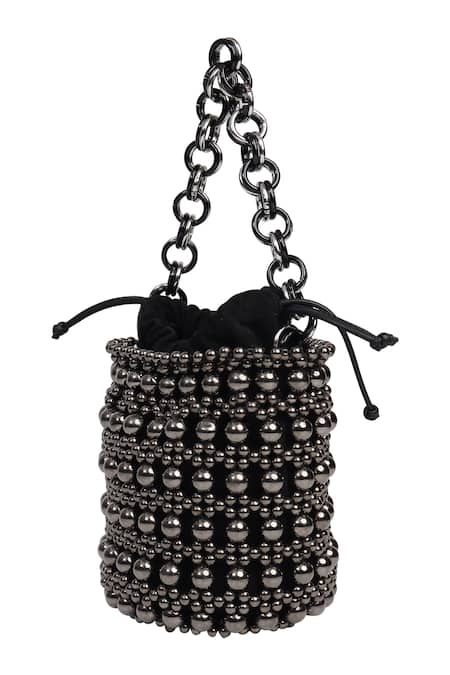 Black bucket bag featuring hand beaded dark grey pearls and a pull-out drawstring closure