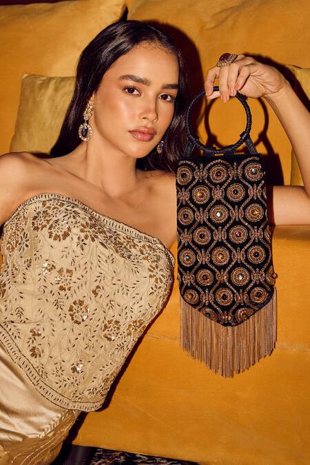 Hand-embroidered navratan stone details, Fringe tassel embellishment, Magnetic closure for easy access