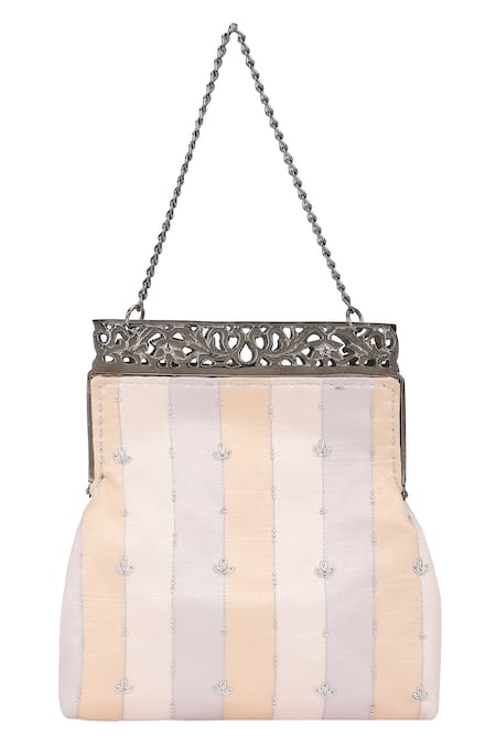Gunmetal wrist chain for easy carrying, Hand-embroidered floral design with zardozi highlights, Color block pattern with satin finish