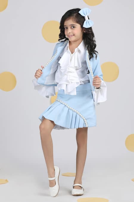 Blue Crepe Pearls Embellished Jacket And Pleated Skirt