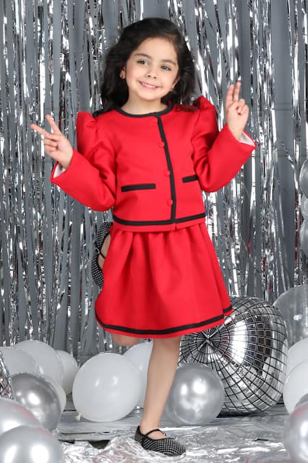 Buy_The Little Celebs_Red Crepe Contrast Border Coat And Skirt Set _Online_at_Aza_Fashions