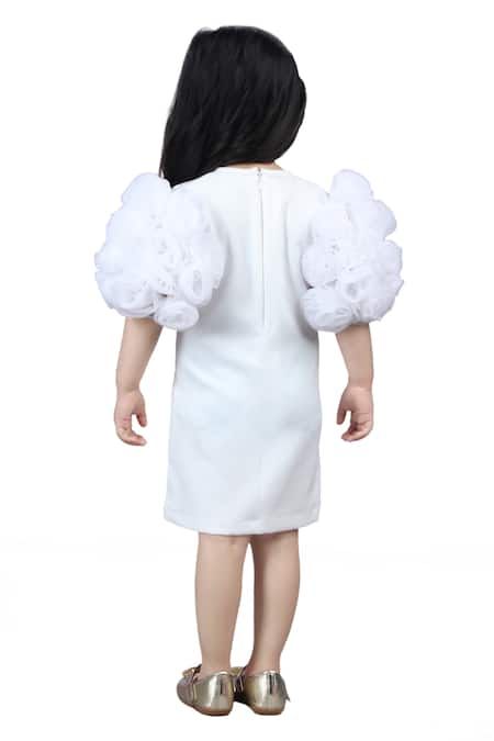 White dress featuring a round neckline and ruffled sleeves adorned with 3D fabric flower embellishments