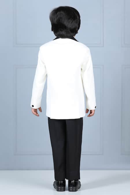 White tuxedo featuring a shawl lapel, full sleeves, and welt pockets. Paired with a quilted shirt, bow, and pant.