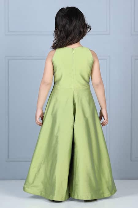 Green Silk, Crepe Embroidery, Pearls, Stones Flared Jumpsuit