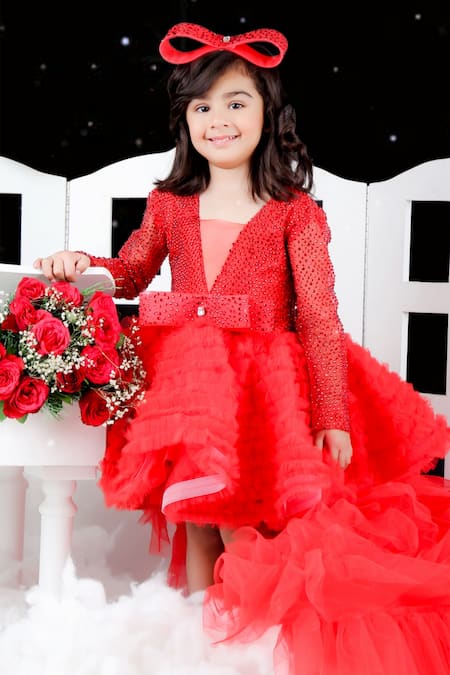 Red dress featuring a Swarovski embroidered bodice, sheer panelled neckline, and full sleeves. Paired with a detachable trail and adorned with a frill hem and front bow embellishment.