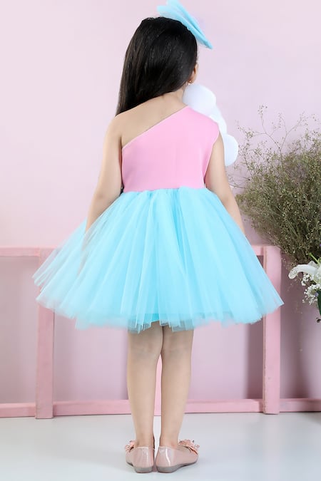 Blue and pink two-tone dress featuring a one-shoulder design with a floral applique detail. Accompanied by a matching hair accessory.
