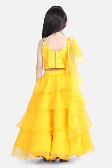 The Little Celebs_Yellow Organza, Satin Pearls, Stones Waistband Embroidered Lehenga Set _Online_at_Aza_Fashions