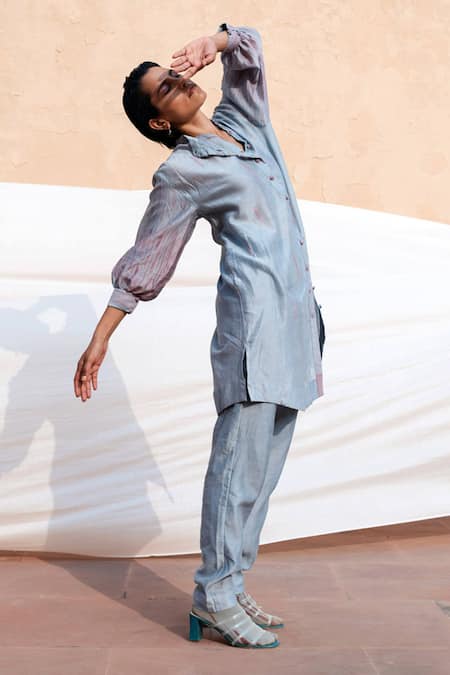 Steel blue shirt style tunic with Shibori dyed detail & front button placket, puff sleeves.