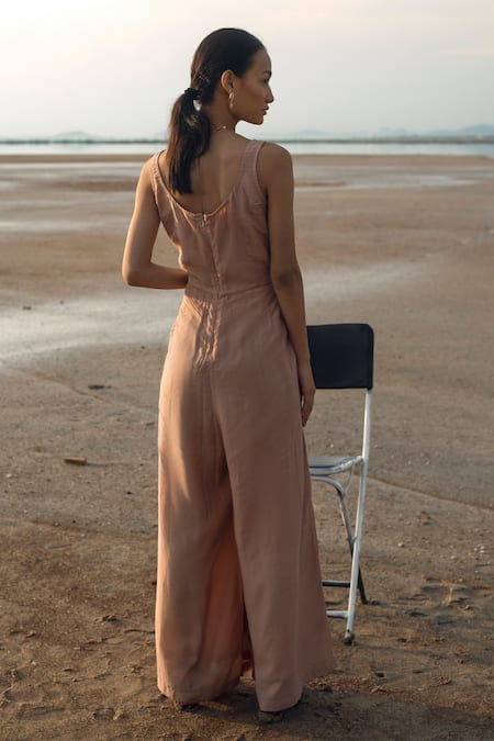 Beige Cotton Silk Boat Embroidered Jumpsuit