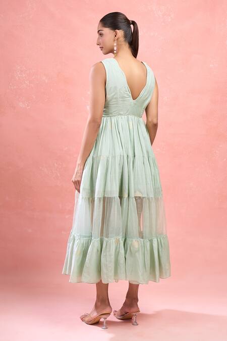 Green Cotton Embroidery V-neck Floral Jamdani Tiered Midi Dress