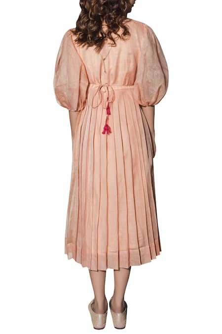 Peach Kota Doriya Silk Thread Embroidery V Neck Pleated Midi Dress