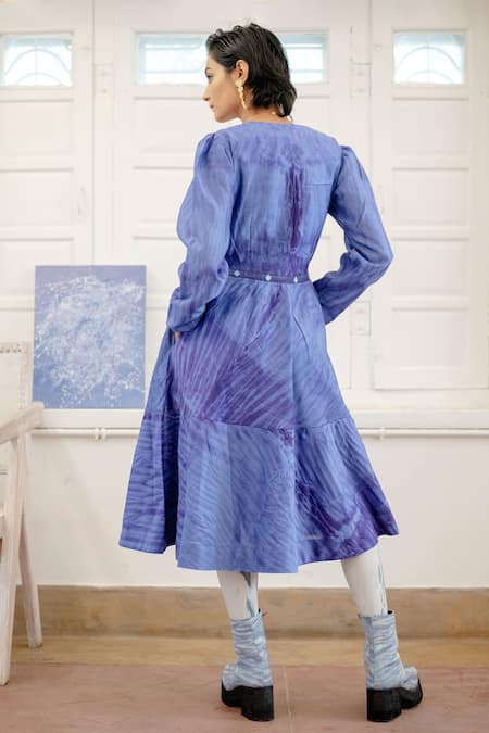 Blue & violet two tier dress with deep V-neck, statement puffed sleeves, Arashi Shibori base, hand embroidered details & side pockets.