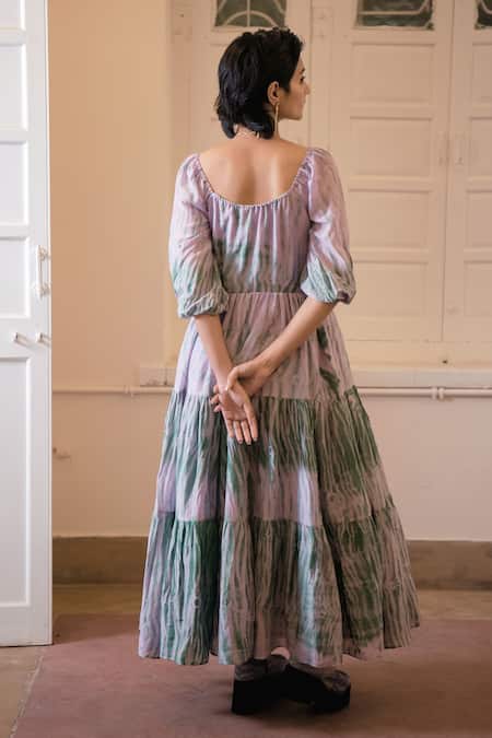 Lilac & teal green three-tier button down dress with smocked bodice & arashi Shibori, bandhani base.