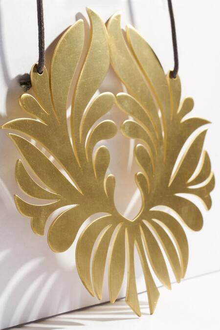 Gold-tone necklace with leaf shaped pendant & thread string.