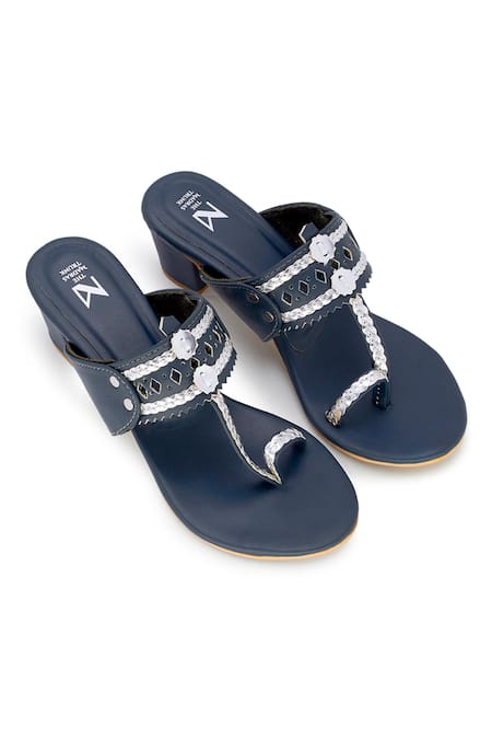 Dark blue kolhapuri block heels featuring a braided strap and split toe detailing