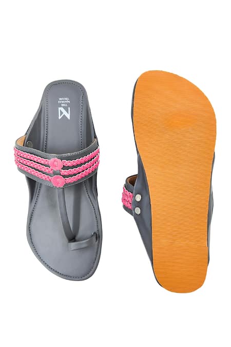 Grey kolhapuri flats featuring contrast braided and cut-out patterns on straps