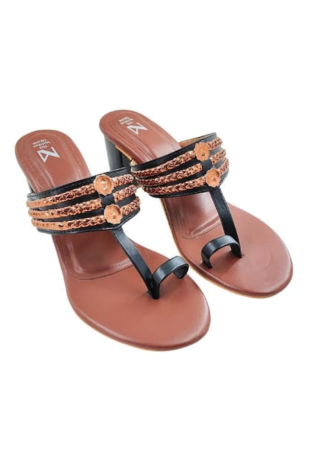 Brown and black kolhapuri heels featuring braided woven strap and split toe ring detailing