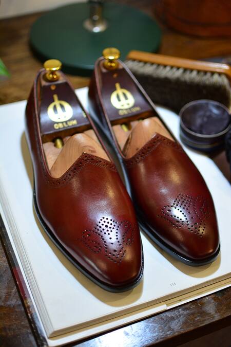Red brogued mojris with patina finish, hand-dyed & stitchline detailing.