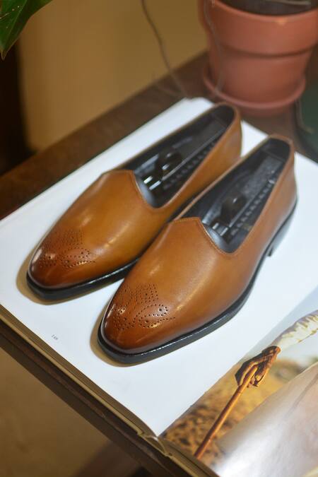 Birtish tan brogued mojris with patina finish, hand-dyed & stitchline detailing.