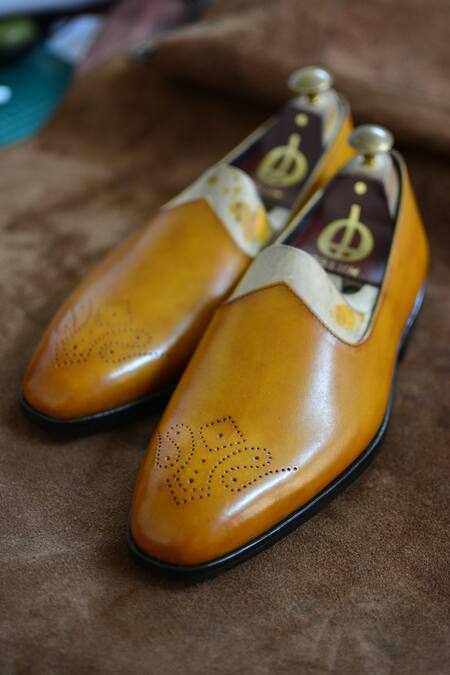 Light tan brogued mojris with patina finish & stitchline detailing.