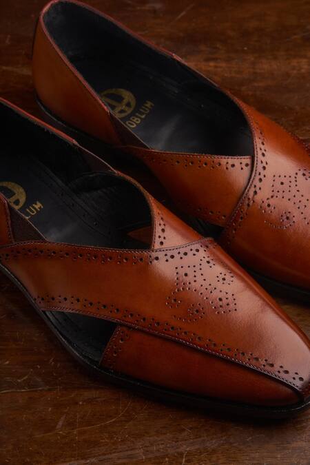 Red brogued Peshawaris with patina finish, side cutout & stitchline detailing.