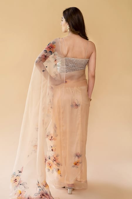Buy_Fallon.Studio By Shruti Kaushik_Brown Imported Pure Silk Organza Magnolia Flowers The Padmini Hand Painted Saree_at_Aza_Fashions