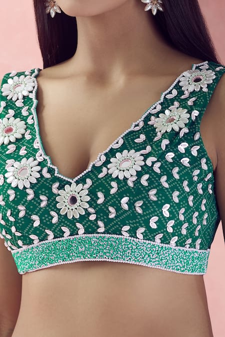 Teal V-neck padded choli featuring bandhani print with mirror and pearl embroidery. Paired with a solid kalidar lehenga.