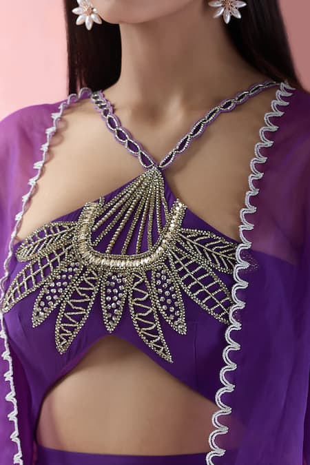 Purple floral embroidered blouse featuring a halter neck design and padded cups. Paired with a lavender asymmetric cape and a cascading draped skirt.