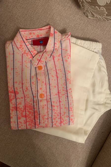 White kurta featuring neon splatter and printed stripes with a front button placket. Paired with an elasticated pant for comfort.