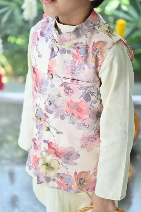 Buy_The Plum Bum_Ivory Linen, Satin, Cotton Embroidery Floral Print Bundi Kurta Set _at_Aza_Fashions