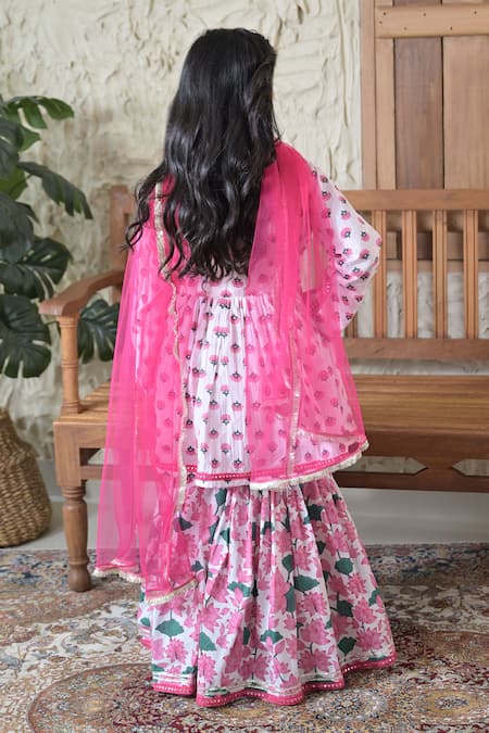 Pink kurta featuring floral hand block print with lace work on the neckline and sleeves. Paired with a floral print sharara and a sheer dupatta.
