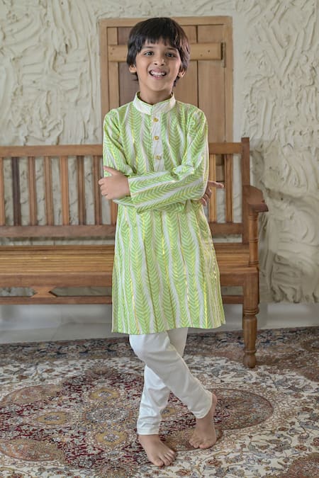 Green kurta featuring leaf stripe pattern highlighted with gold stripes. Paired with a solid pant.