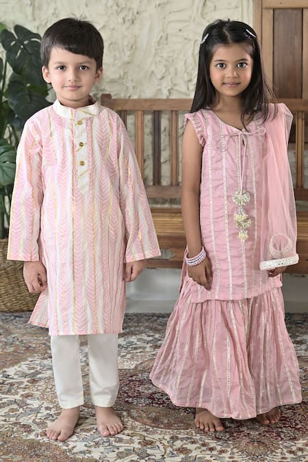 Pink Cotton Leaf Stripe Pattern Kurta With Pant