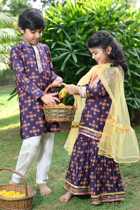 Navy blue kurta featuring mirror embroidered placket and gota embroidered collar. Paired with matching pants for a complete look.