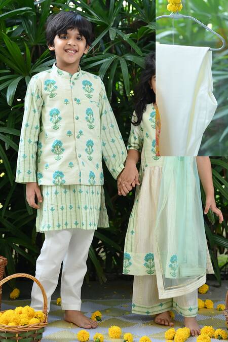 Multicolor bundi featuring floral block print with a band collar and long sleeves. Paired with a matching kurta and pant in cotton fabric.