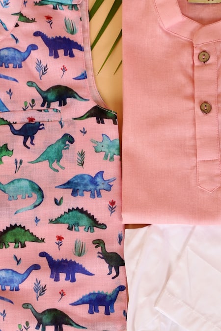 Pink Cotton, Linen Printed Dinosaur Bundi And Kurta Set