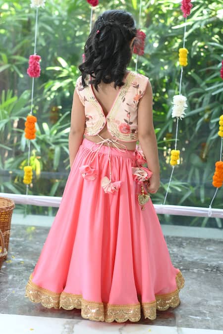 Buy_The Plum Bum_Peach Satin, Chiffon, Net Sequins, Embroidery, Fabric Scallop Lehenga Set