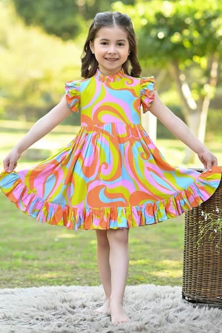 Multi Color Rayon, Cotton Ruffles Abstract Print Dress