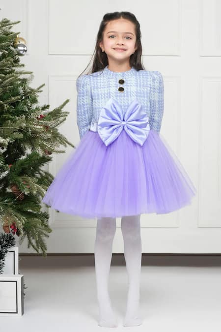 Lavender houndstooth dress featuring long puffed sleeves and a satin bow in the center