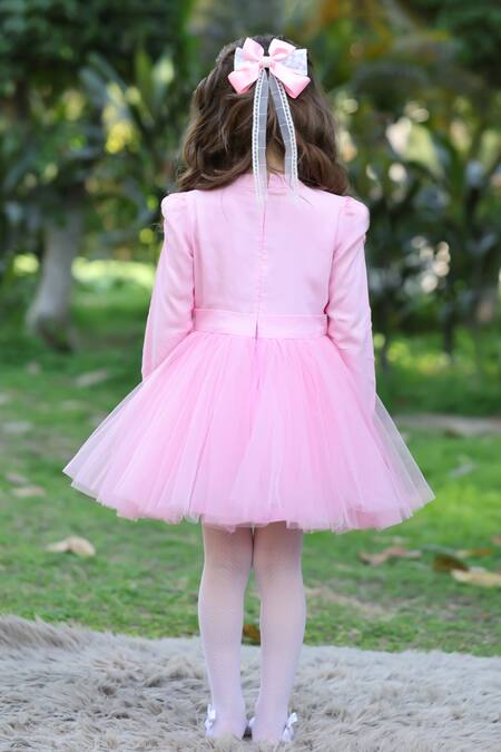 Pink designer dress made from 100% cotton, featuring a heart-shaped embellishment and a flowy tulle skirt