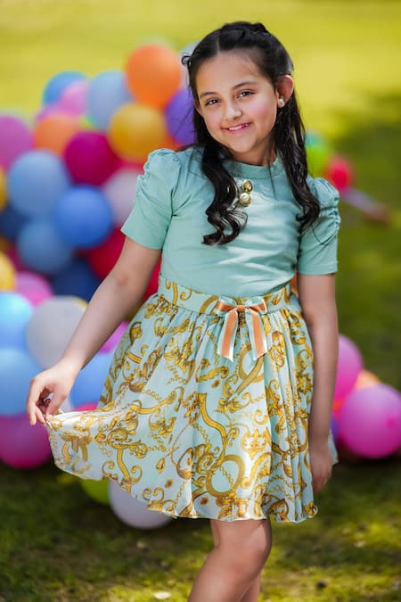 Blue blouse featuring ruched sleeves and a band collar. Paired with a printed flowy skirt with an attached bow waist detail and golden buttons.