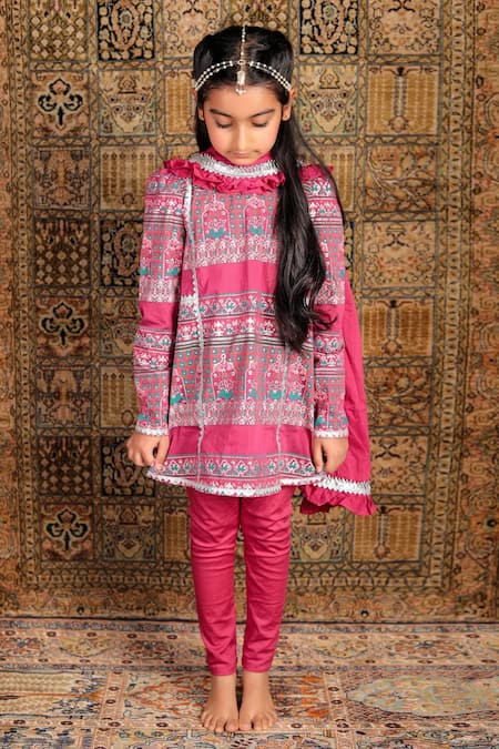 Pink silk kurta featuring all over foil print motifs and gota lace detailing. Paired with a matching cotton lycra churidar and a mulmul dupatta.