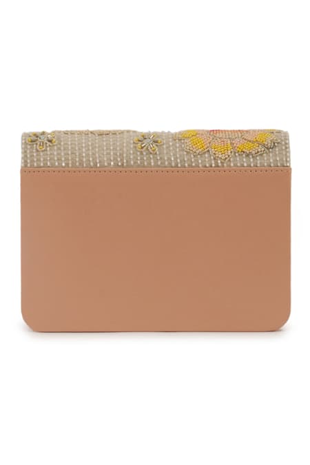 Beige clutch featuring hand embroidery with multi color beads and cutdana