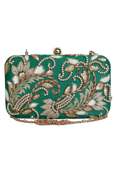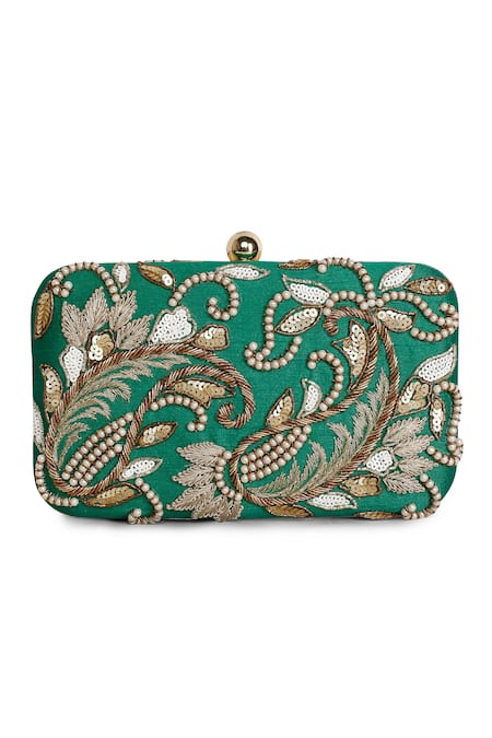 Buy_The Purple Sack_Green Embroidery Double Paisley Hand Clutch _Online_at_Aza_Fashions