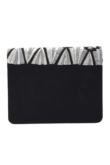 Black rectangular flap clutch featuring contrast grey hand embroidery