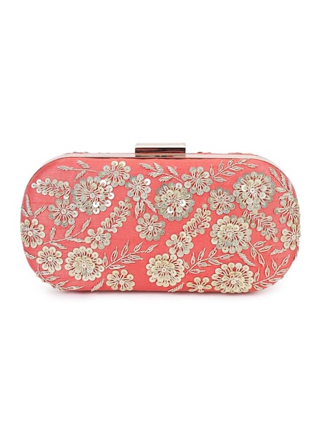 Buy_The Purple Sack_Peach Embroidery Raw Silk Flower Clutch _Online_at_Aza_Fashions