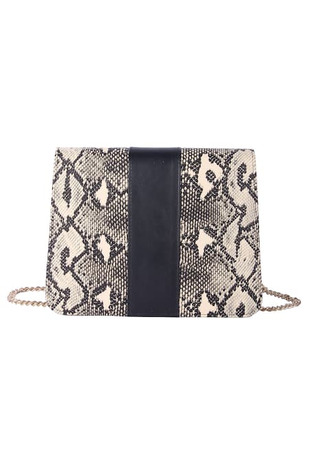 Beige & black handbag featuring an envelope flap design with all over snakeskin print
