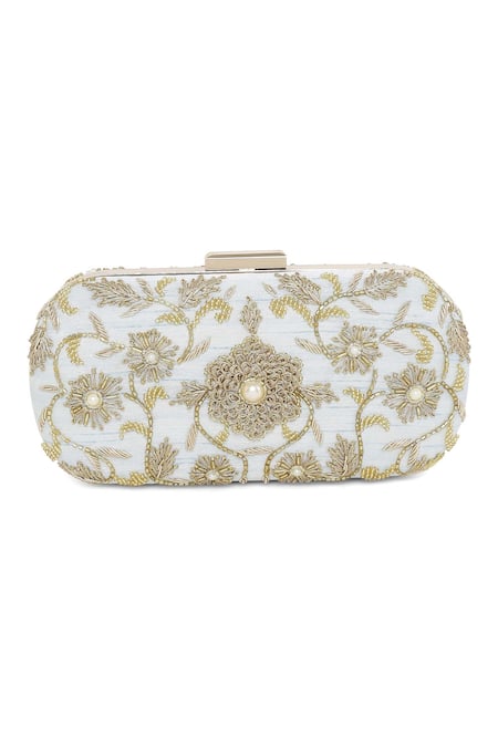Blue raw silk clutch featuring hand embroidered floral motifs with beads, pearls, and cutdana